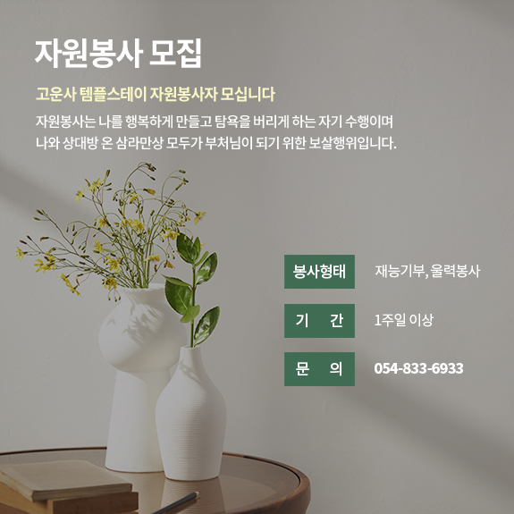 고운사 템플스테이경북 의성군 단촌면 고운사길 415(구계리 116) Tel. 054-833-6933 FAX. 054-833-6934